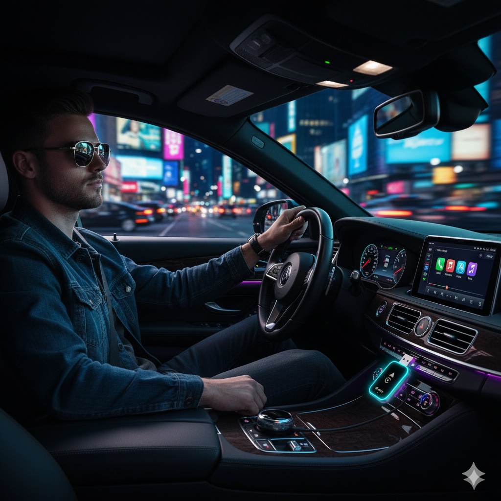 Works with **both Apple CarPlay and Android Auto** in one compact adapter — no separate devices needed.