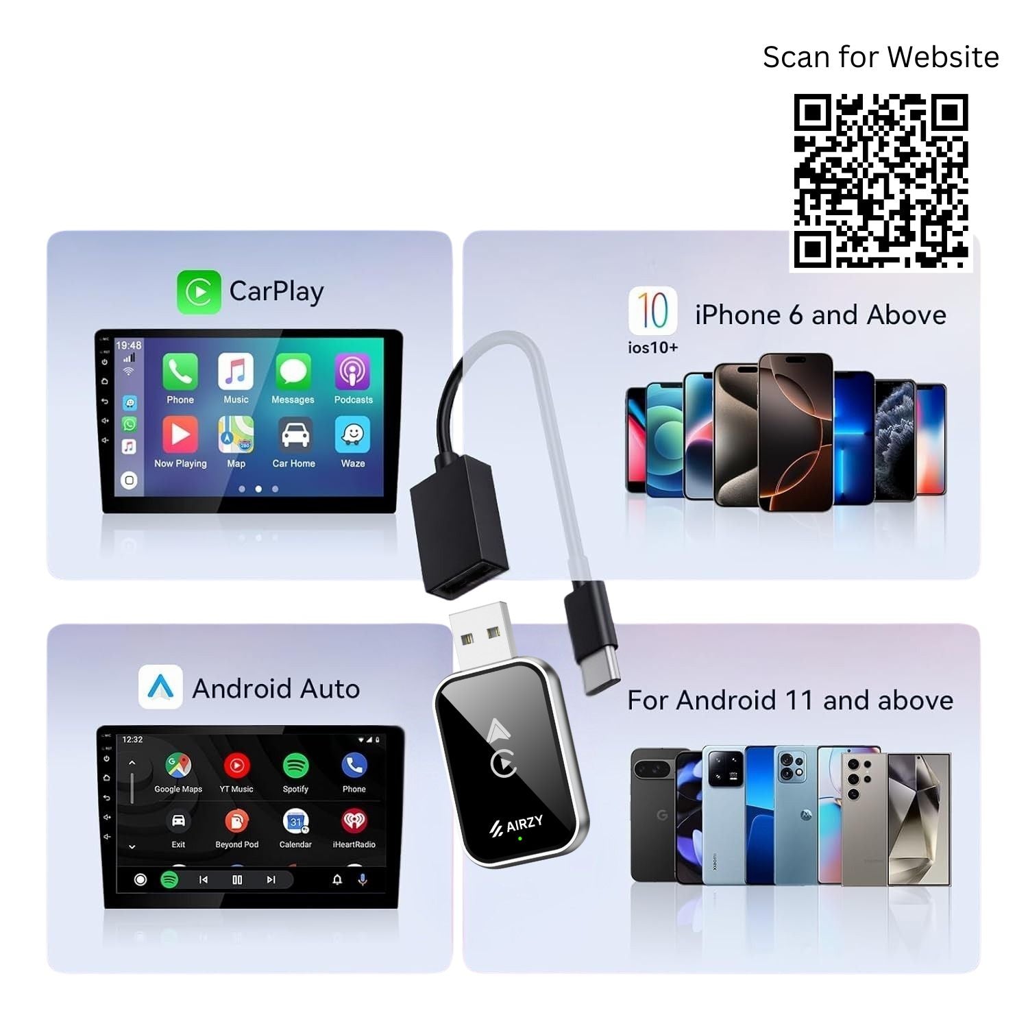 Whether you’re team iPhone or Android, Airzy’s dual-protocol adapter supports both CarPlay & Android Auto seamlessly — no app, no update required.